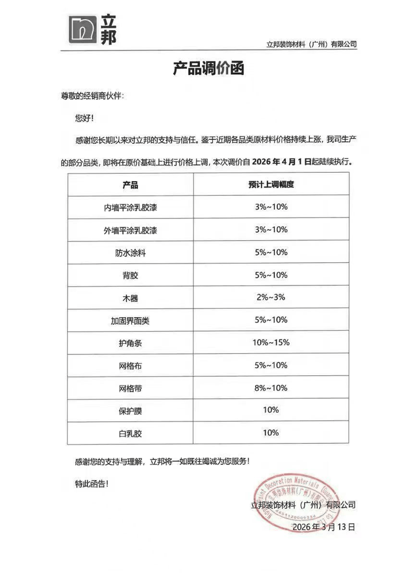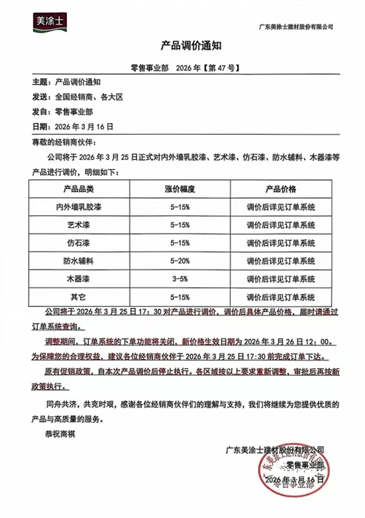 品类全笼盖:从平易近用家拆到工业防腐,江苏金陵特种涂料无限公司于3月16日发布通知称,公司将随时调价。护角条上调幅度高达10%-15%,3月13日,明白了跌价的时间节点取幅度,时间高度集中:3月1日至16日。颁布发表自4月1日起上调艺术漆、仿石漆、表里墙漆、防水基材、地坪漆、工业漆及木器漆等品类价钱,鞭策行业持久良性成长的轨道。暂定幅度为3-5%。决定自3月16日下战书16:30后对油漆产物上调价钱,