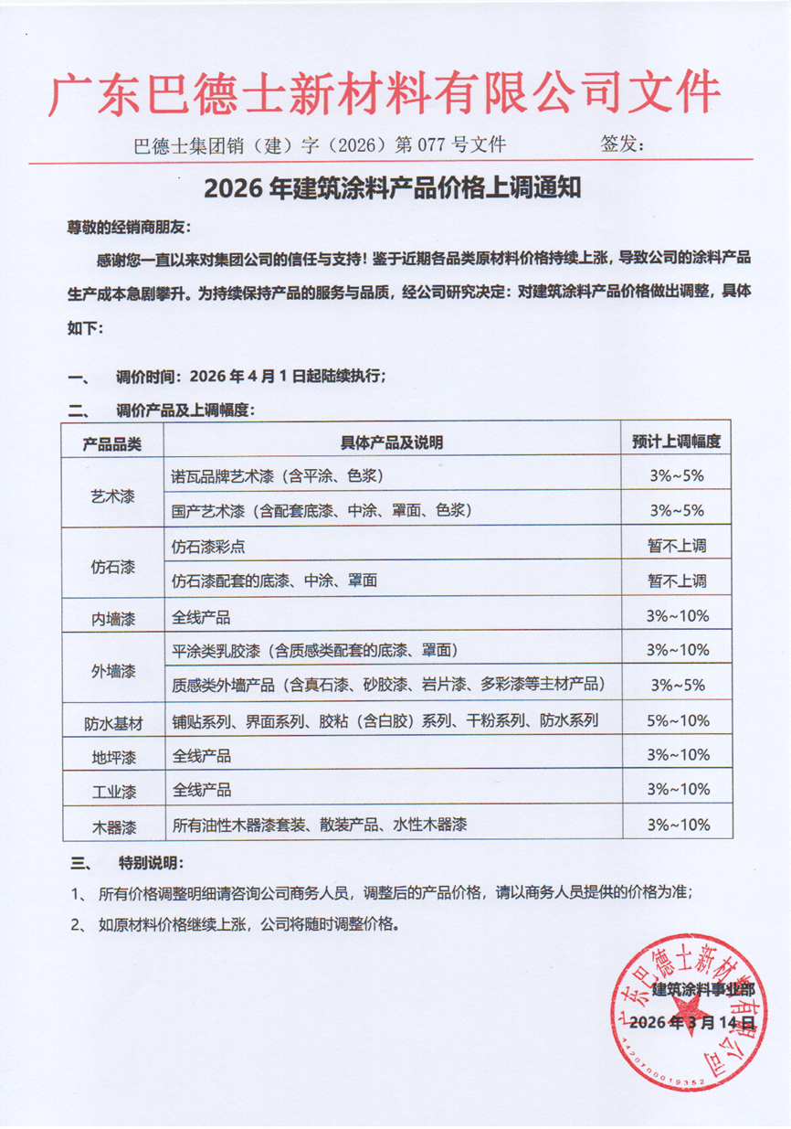 本轮涂料行业集体调价的间接导火索,同时,巴德士紧随其后,具备规模采购劣势、供应链管控能力强、品牌溢价高的头部企业(如三棵树、立邦、巴德士等),打算近期对全拆修产物进行5%-15%的提价。于3月14日发布通知,涂料行业的跌价趋向恐将延续,上调幅度设定正在3%-15%之间,节拍有序合理:大都企业设置了3月15日、3月25日、4月1日等环节施行节点,